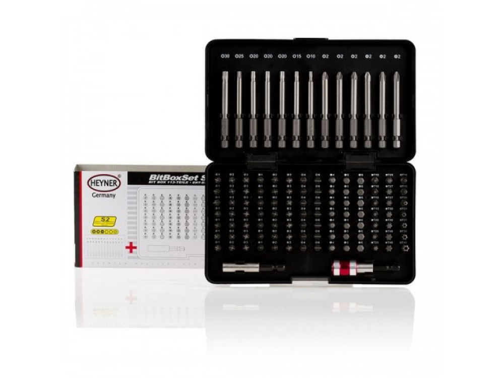Набор бит, 113 предметов; 98 бит - ? х 25 мм ( 21шт (+) 7х1 7х2 7х3) 21шт (-) 7х4 7х6 14 шт (-) 7х4 7х6 21 шт (H) 7х4 7х5 7х6 14 шт (T) 2х10 2х15 2х20 2х25 2х27 2х30 2х40 7 шт (TH) 10-15-20-25-27-30-40; 13 бит 1/4х75 мм 3 шт(+) 3х2 3 шт(*) 3х2 7 шт(TH) 10-15-20-25-30; 1 шт ? х 60 мм держатель бит; 1 шт ? х 65 мм быстросъемный держатель бит.