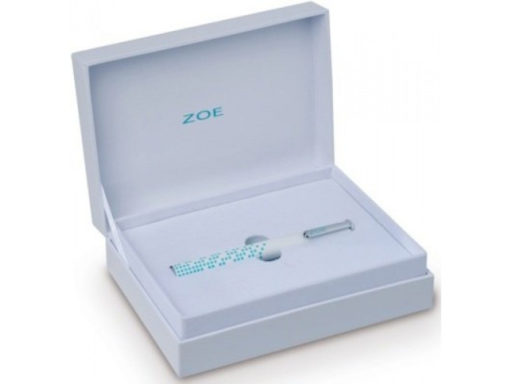 White varnished ball point pen, screwed cap, printing 360° in blue colour on the body, logo on clip and top of cap. Delivered in customized gift box. Артикул: 77 11 574 828
