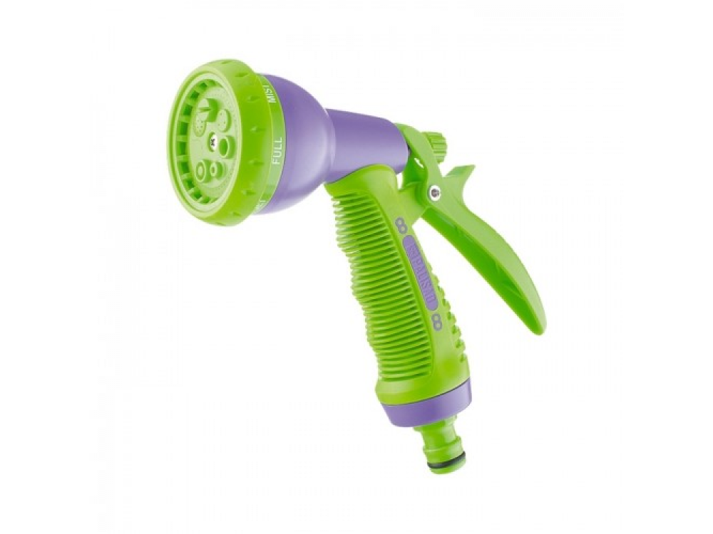 Пистолет-распылитель со штуцерной посадкой и курком, расположенным сзади. Оснащен регулируемой форсункой, что обеспечивает шесть режимов полива: душ, туман, конусную струю, центральную струю, плоско-горизонтальную струю, жесткую струю. Имеет фиксатор курка для непрерывной работы.