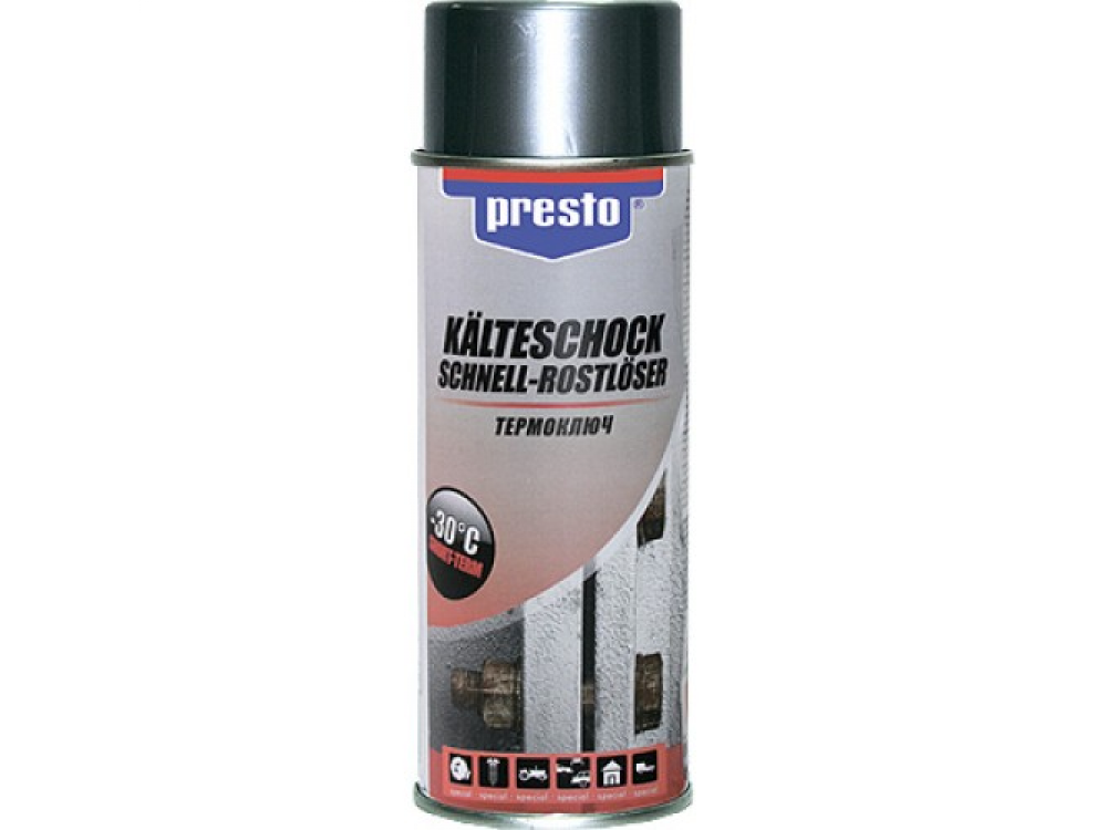 Антикоррозийная смазка на основе минерального масла для отвинчивания заржавевших резьбовых соединений. PRESTO Термоключ способствует удалению ржавчины, действует мгновенно. Не содержит силикон и жир. Разрушает коррозию за счет резкого кратковременного понижения температуры обрабатываемой поверхности до -30°С, вызывая усадочную деформацию и одновременно пропитывая соединения маслом.